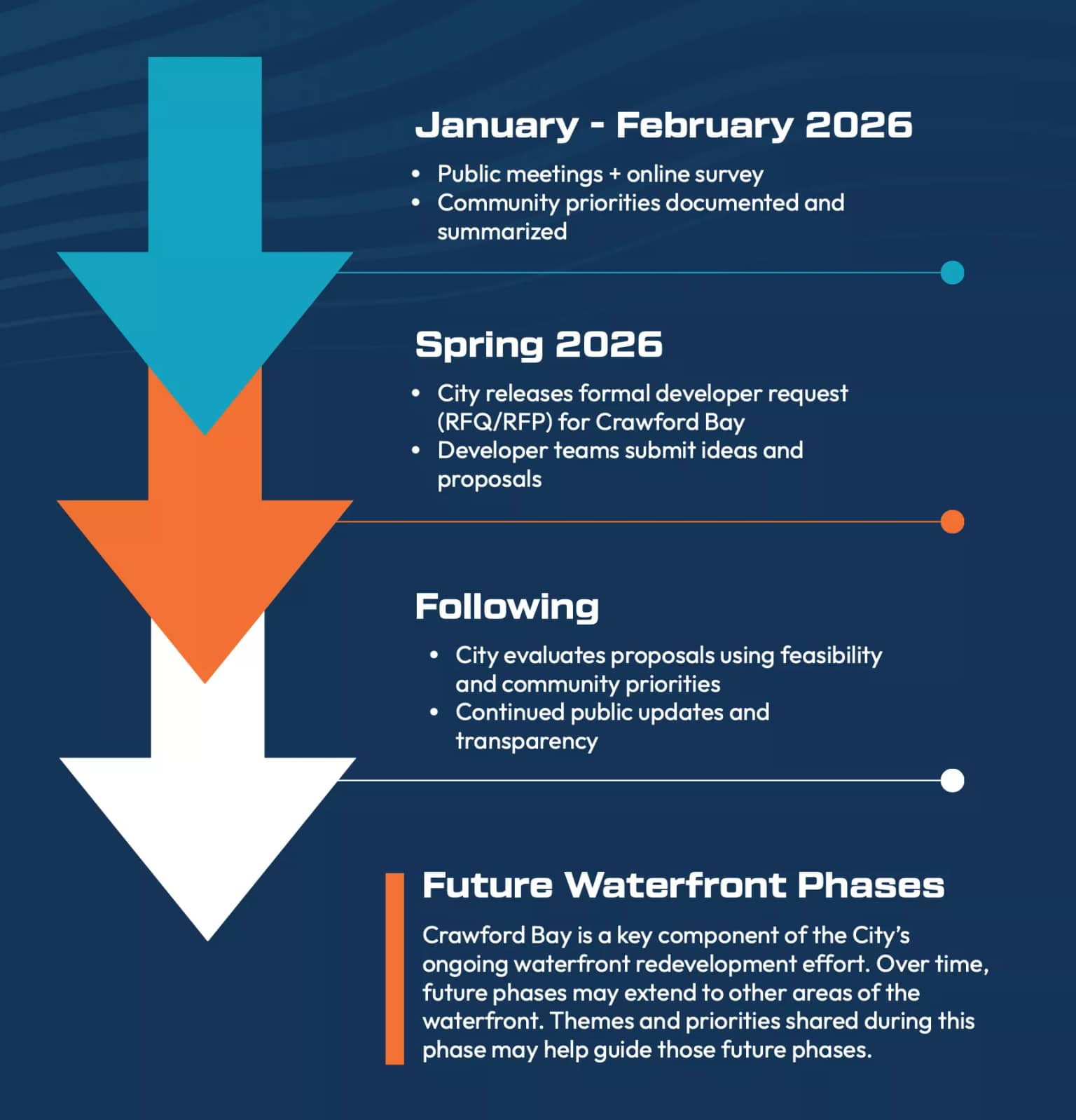 The City of Portsmouth is currently in the planning and early engagement phase for the Crawford Bay Waterfront Redevelopment. Over the coming months, the City will: